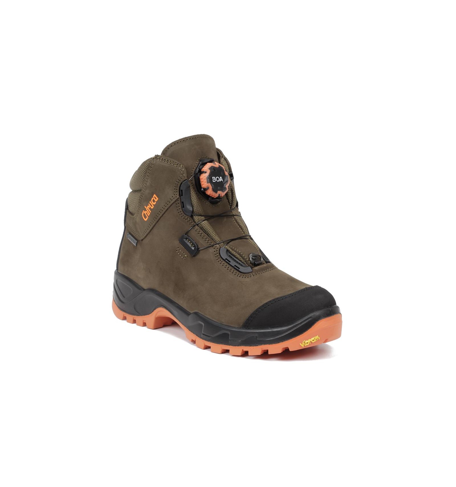 Bota de piel nobuck hidrofugada, cordura hidrofugada, refuerzo puntera de pampa, BOA® Fit System, refuerzo en puntera, membrana Gore-Tex impermeable y transpirable; piso bidensidad Hawk con entresuela de poliuretano expandido y patín de caucho Vibram® Impulse Hi-Vis que proporciona amortiguación y adherencia.